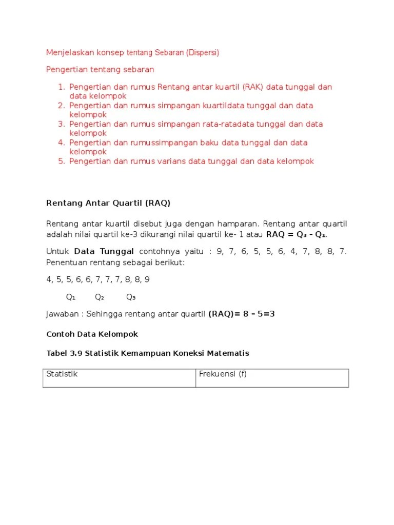 Pada desil, data dibagi menjadi. kuartil adalah suatu bilangan yang dapat dianggap membagi data yang telah diurutkan menurut besarnya, dari yang terkecil ke yang terbesar menjadi empat sub kelompok sama banyak. Atau dengan jak (jangkauan antar kuartil), k3 = kuartil ke 3, k1 = kuartil ke 1). Contoh soal jangkauan antar kuartil data berkelompok. kuartil pertama (q1), sering disebut sebagai kuartil bawah merupakan nilai yang membagi bagian pertama dari keseluruhan nilai pengamatan menjadi 2 bagian.